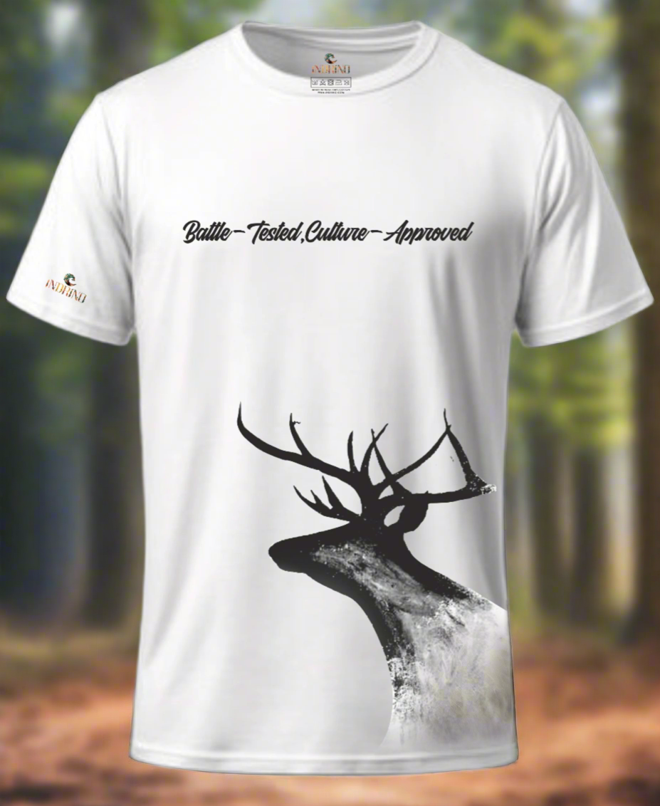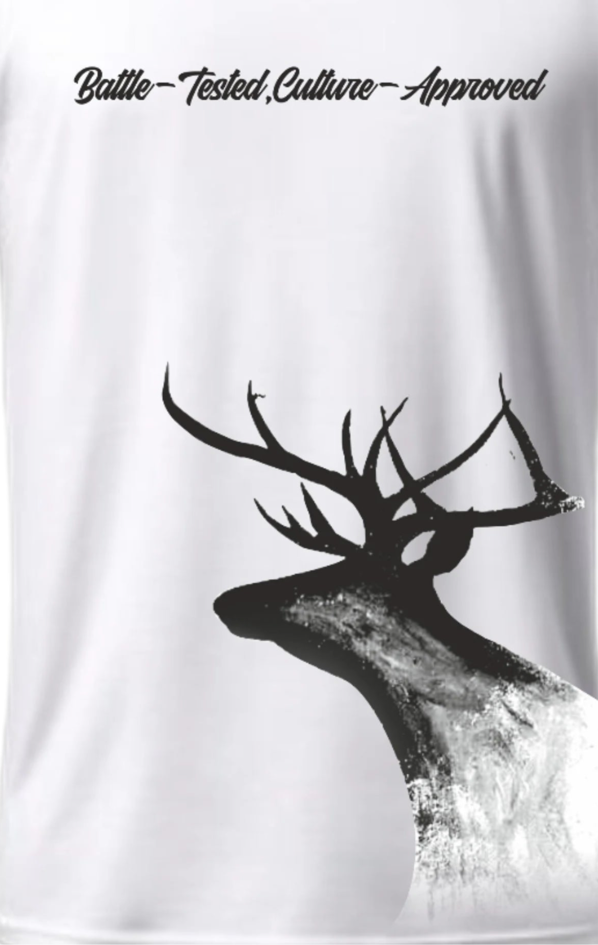 A white t-shirt showcasing a deer head graphic, emphasizing a nature-inspired theme.