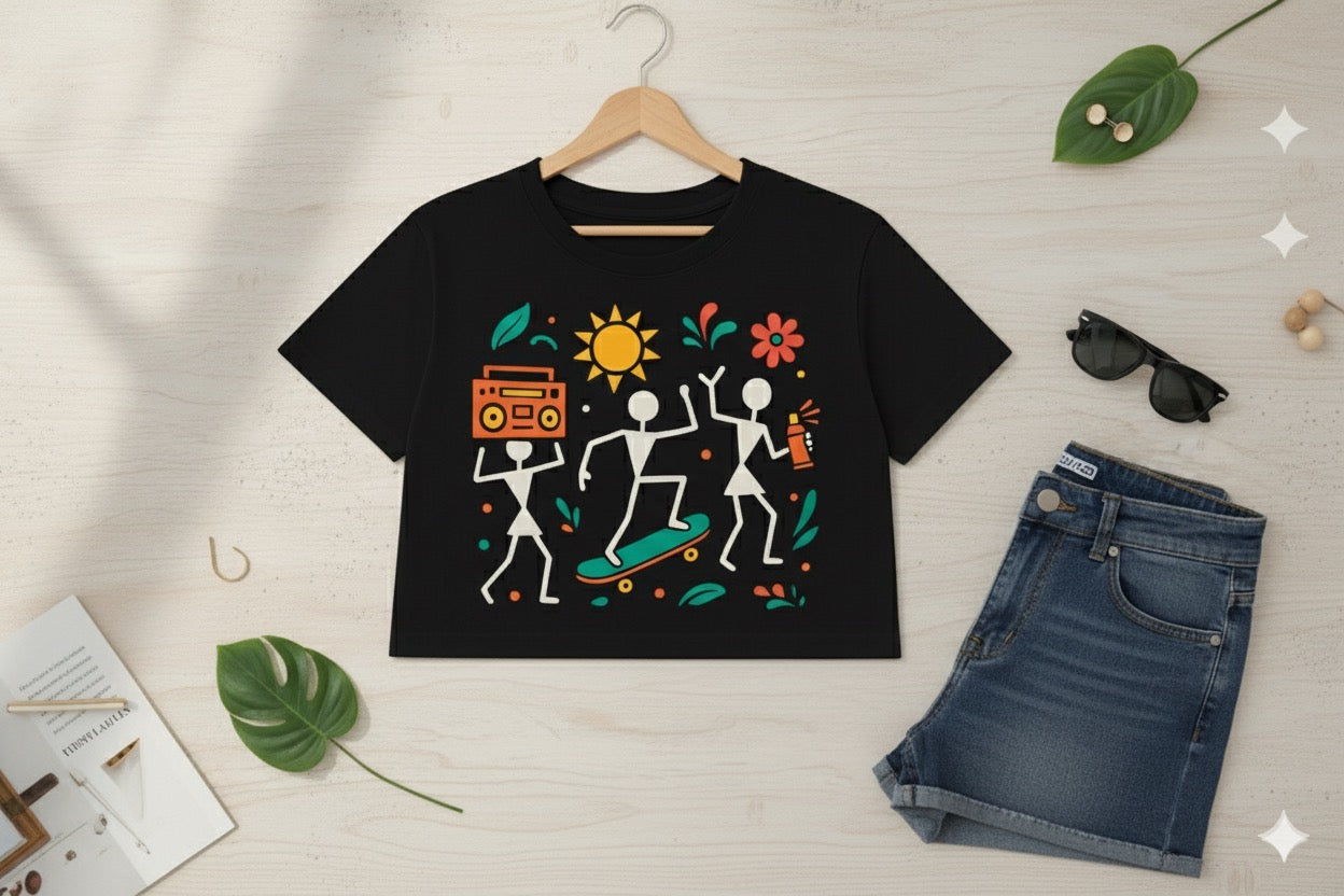 Move with culture, vibe with rhythm. The Street Rythmika Crop Top is crafted from 180 GSM premium cotton, making it lightweight yet durable for all-day comfort. The bold front print blends folk stick-art figures with modern street elements — boombox, skateboard, and dance — symbolizing the energy of the streets meeting the roots of tradition.