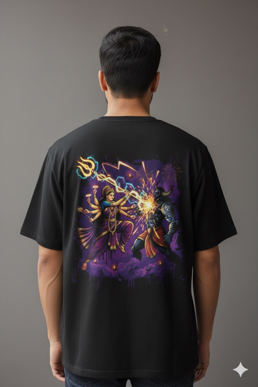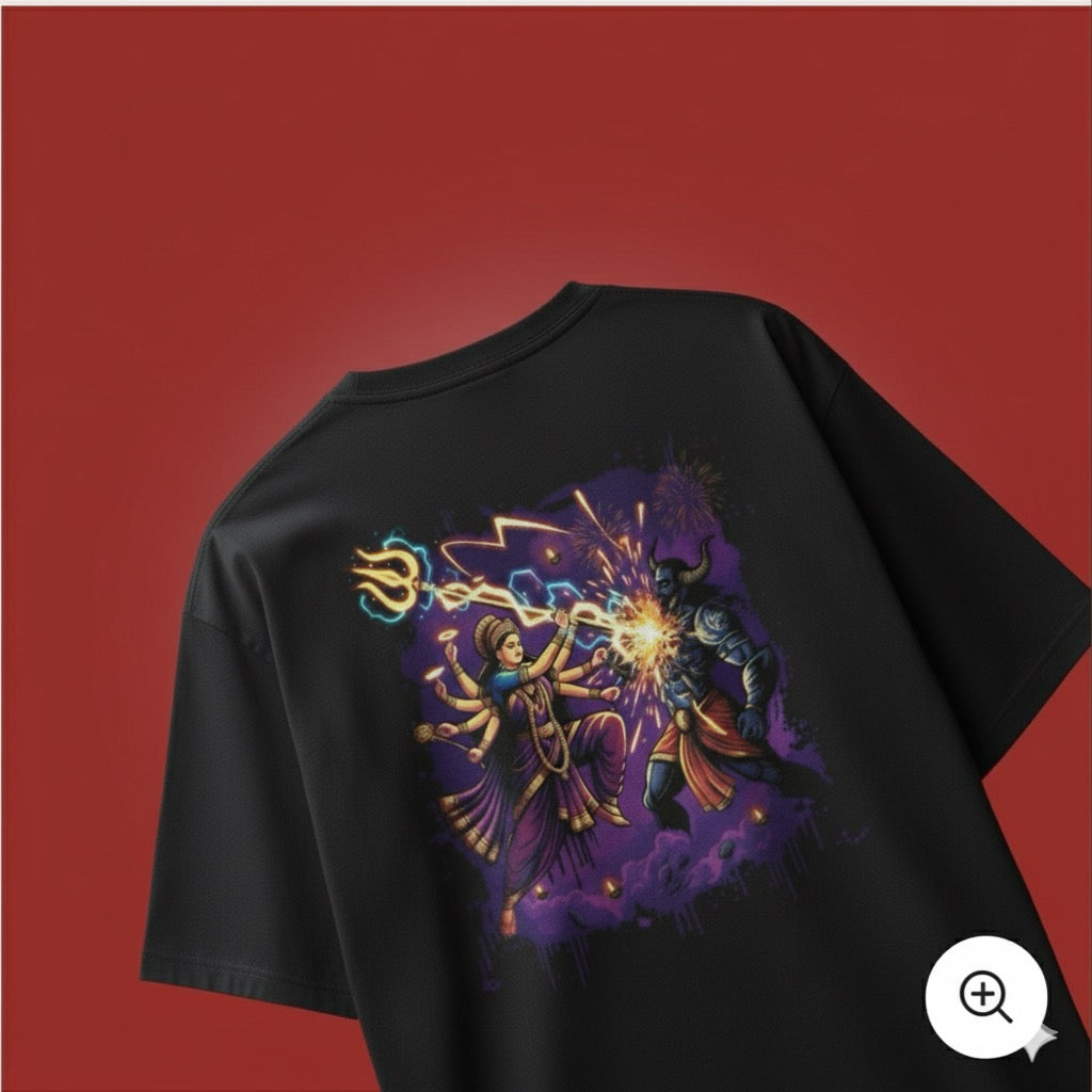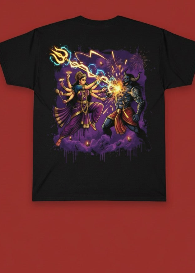 When divinity met defiance — The First Strike captures the fierce moment Sathyabama, the warrior goddess, strikes down the demon Mahishasura. A story of power, protection, and purpose — reimagined in Indrino’s signature streetwear language.