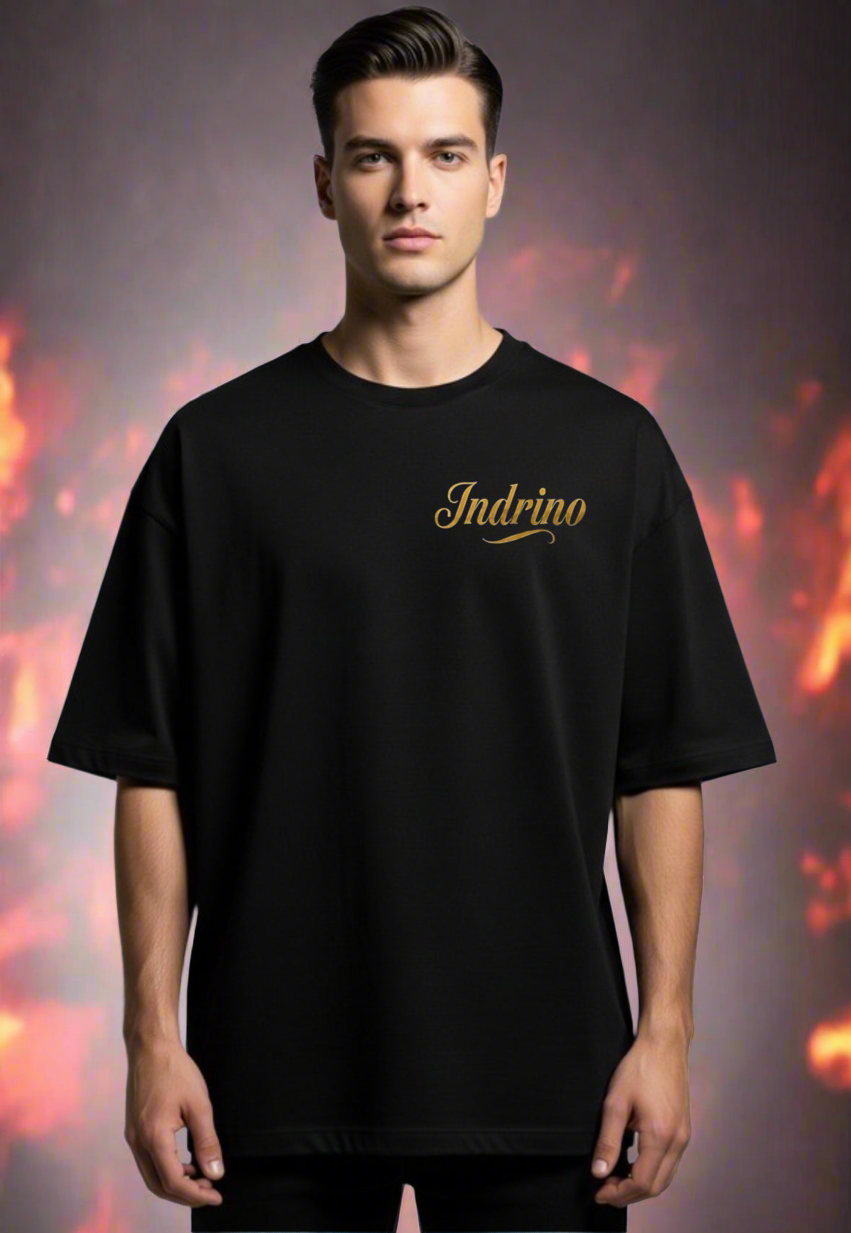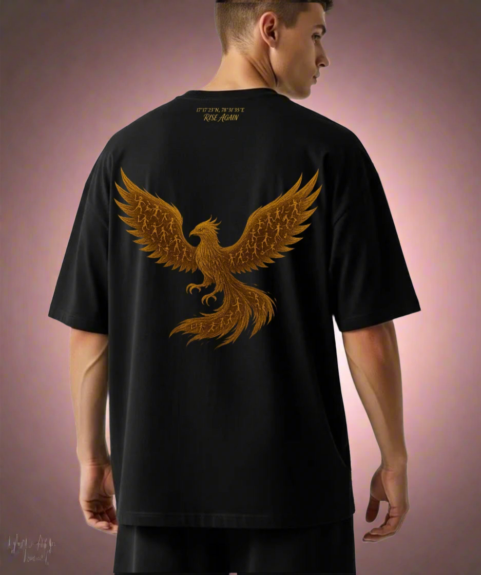 Crafted in premium 240 GSM French Terry cotton, this oversized black tee embodies power and heritage. On the back, a majestic gold metallic phoenix rises — symbolizing rebirth, resilience, and transformation.